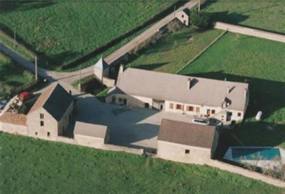 Luchtfoto van het huis met zwembad en bijgebouwen